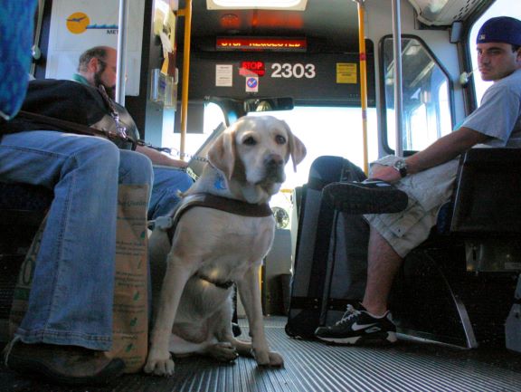 Guide Dog on a bus, by Richard Masoner, https://www.flickr.com/photos/bike/4668187364 used under Attribution-ShareAlike 2.0 Generic (CC BY-SA 2.0) https://creativecommons.org/licenses/by-sa/2.0/